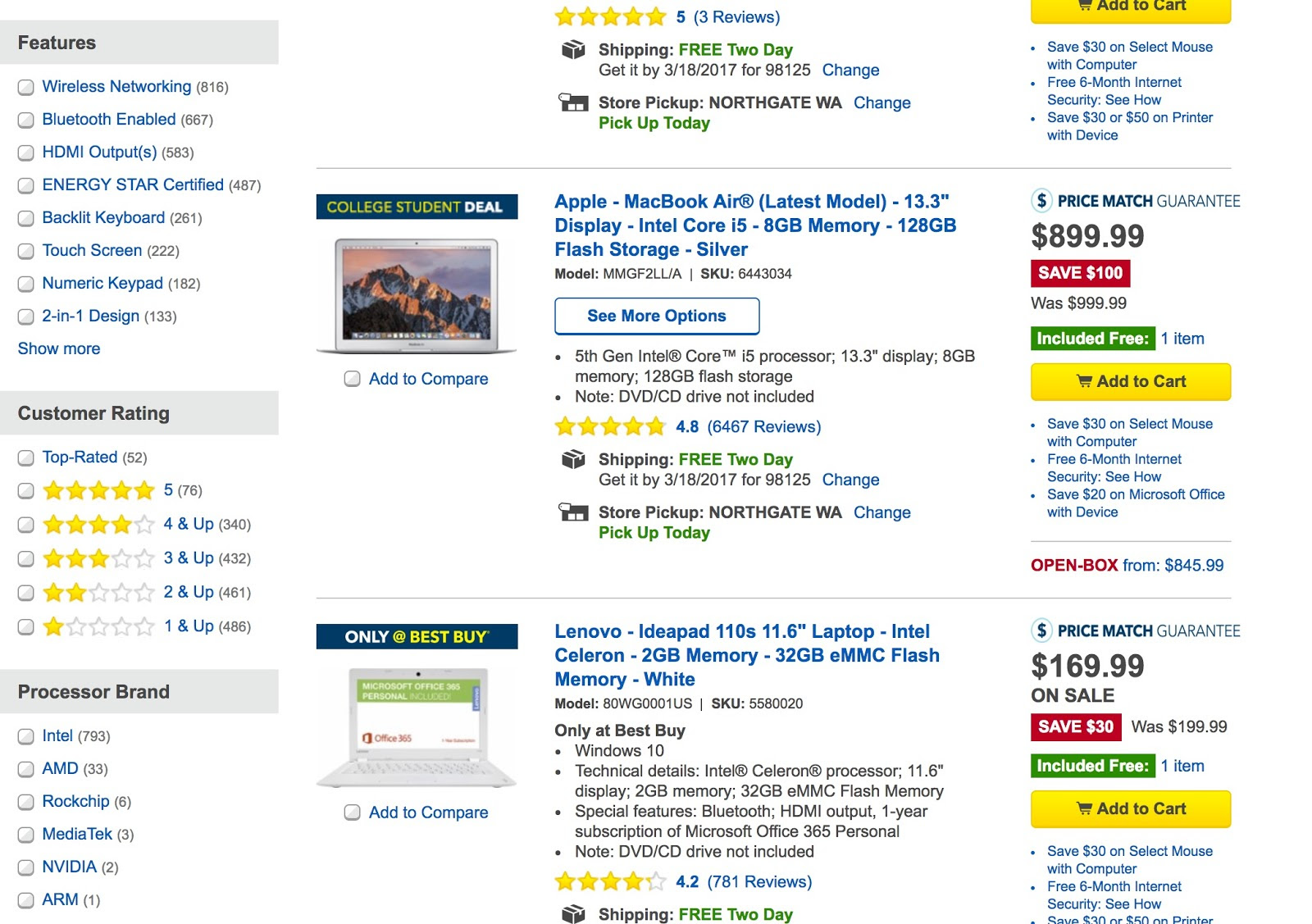 As a quick refresher, we can define faceted navigation as any way to filter and/or sort results on a webpage by specific attributes that aren’t necessarily related. For example, the color, processor type, and screen resolution of a laptop. Here is an example: